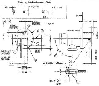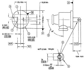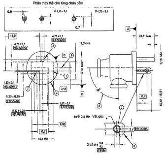 | GIẢI THÍCH CÁC CHỮ SỐ TRÊN TỜ RỜI TIÊU CHUẨN 2, 3, 4, 6 VÀ 7 1. Chu vi không được nhỏ hơn các kích thước nhỏ nhất của mặt tiếp giáp. 2. Lỗ này là tùy chọn. Nếu sử dụng, lỗ phải có vị trí và kích thước như thể hiện trên hình. 3. Góc 90° thể hiện gốc lớn nhất cho phép đổi hướng cho cáp và dây nguồn mềm. 4. Chu vi của phích cắm không được vượt quá kích thước đường kính lớn nhất thể hiện trên hình để đảm bảo việc cắm vào ổ cắm kép thích hợp trong tờ rời tiêu chuẩn 1A hoặc 5A. 5. Để tránh hỏng cơ cấu chớp an toàn, đầu mút của các chân cắm không được có cạnh sắc hoặc bavia. 6. Đối với các chi tiết có hình dạng không phải hình trụ, các đặc trưng về cấu hình phải bắt nguồn từ, và hướng từ đường tâm của vòng tròn theo lý thuyết một cách tương tự như chỉ ra trên hình. 7. Việc chỉ thị các đầu nối khác là tùy chọn. Các chỉ thị phải được đặt gần các đầu nối. Không cần ghi nhãn các chân cắm thuộc loại không tháo dây được. 8. Đầu nối đất phải được chỉ thị bằng ký hiệu IEC 60417-5019 (2006-08). |