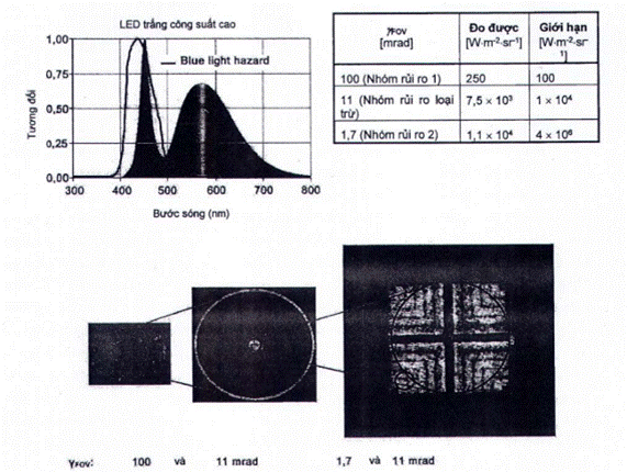Cần lưu ý là các xem xét nêu trên bị giới hạn ở nguy hiểm quang hóa và cần thận trọng trong các trường hợp khi cũng cần xem xét các nguy hiểm nhiệt lên võng mạc. Đặc biệt đối với nhóm rủi ro loại trừ, góc chấp nhận áp dụng được đối với phép đo bức xạ lấy trung bình trong không gian theo TCVN 13079-1 (IEC 62471) khác với góc cần áp dụng cho các nguy hiểm quang hóa.