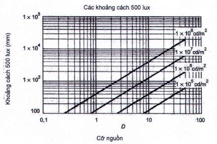 Đối với nguồn đơn có kích thước D, khoảng cách 500 lux chỉ phụ thuộc vào độ chói của nguồn: