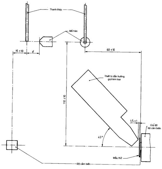 Định vị khung đỡ mẫu (5.4) sao cho khoảng cách thẳng đứng giữa tâm mỏ đốt và đường qua tâm nằm ngang của bộ cảm biến (5.3) là 110 mm ± 10 mm. Điều chỉnh khoảng cách giữa trục của thanh thép và mặt phẳng đi qua đường trực tâm thẳng đứng của bộ cảm biến vuông góc với mặt của nó là 15 mm ± 10 mm ở phần đối diện với đầu mỏ đốt đèn hàn (xem hình 1).