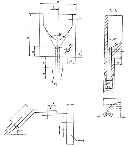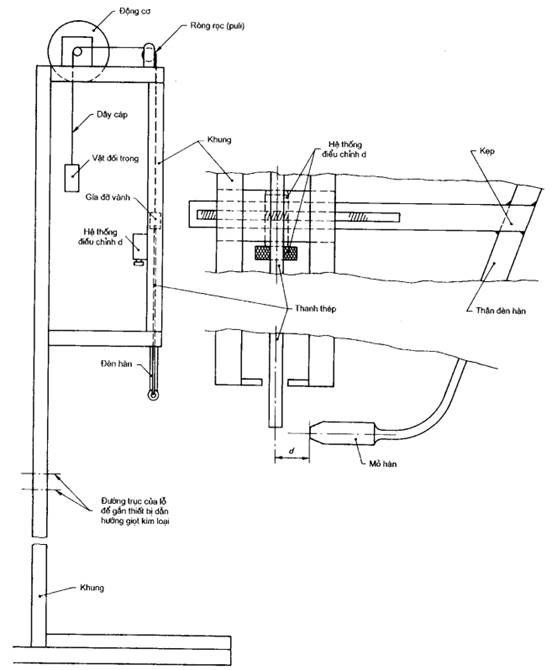 Trục của mỏ hàn vuông góc với thanh thép. Khoảng cách d giữa thanh thép và đầu mỏ hàn có thể điều chỉnh được (xem Hình 2)