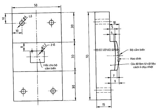 Giá đỡ bộ cảm được chế tạo bằng máy từ vật liệu cách điện, chịu nhiệt có độ dẫn nhiệt 0,125W/(m.K) ± 0,015W/(m.K) ở 40oC và có nhiệt dung riêng là 1,15 J/(g.K) ± 0,1 J/(g.K) có kích thước như trong Hình 4. Có hai lỗ nằm cạnh tâm để dây chì đi qua đến bộ cảm biến và 4 lỗ ở các góc để gắn giá đỡ mẫu.