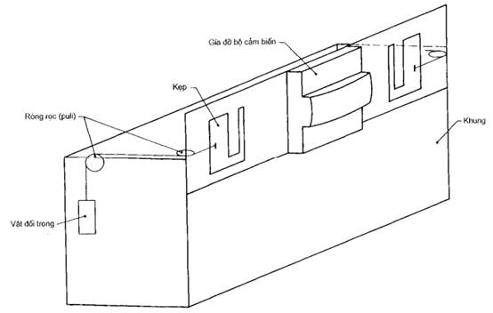 Khung đỡ mẫu thử cũng dùng để đỡ bộ cảm biến (5.3). Khung đỡ này cho phép giữ mẫu ở trạng thái căng bằng hệ thống puli-kẹp và bởi một đối trọng (xem Hình 5). Sử dụng các đối trọng 175g ± 5g trên ròng rọc cả hai phía của mẫu thử hoặc, cố định một đầu của mẫu thử bằng một cái kẹp và gắn một đối trọng 175g ± 5g ở đầu kia. Vị trí của khung giữ mẫu có thể điều chỉnh được theo phương nằm ngang và thẳng đứng.