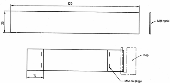 Cắt mẫu thử với kích thước 120mm x 20mm từ mẫu phòng thí nghiệm ở khoảng cách ít nhất 50mm từ các mép của mẫu. Gấp mép ở hai đầu mẫu với chiều rộng 15 mm và dập ghim để tạo khả năng xiết chặt chúng vào các kẹp (xem Hình 6).
