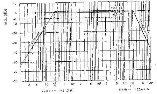 Bộ lọc thông dải băng tần này có tỷ số truyền dẫn hầu như không đổi giữa tần số giữa 22,4 Hz và 22,4 kHz và giảm dần ở phía ngoài của băng tần với tốc độ được quy định đối với các bộ lọc băng tần 1 octa, có các tần số ở giữa băng là 31,5 Hz và 16 000 Hz được quy định trong IEC 225: Bộ lọc băng tần 1 octa, 1/2 octa và 1/3 octa dùng để phân tích âm thanh và rung, có độ dốc của đáp tuyến nằm trong giới hạn của quy định kỹ thuật này.