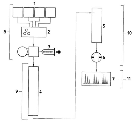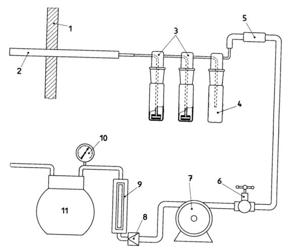 | 1. Thành ống dẫn khí thải 2. Đầu lấy mẫu và bộ lọc bụi 3. Các bình hấp thụ chứa dung dịch H2O2 3% 4. Bình bẫy (tuỳ chọn) 5. ống sấy khô 6. Van điều chỉnh | 7. Bơm 8. Bình đệm (tuỳ chọn) 9. Lưu lượng kế 10. Nhiệt kế 11. Đồng hồ đo khí khô |