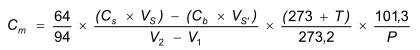 Nồng độ khối lượng lưu huỳnh dioxit (Cm) tính bằng mg/m3 có trong mẫu khí thải ở trạng thái xác định P = 101,3 kPa và T = 273,2 K, ứng với khí khô theo công thức sau: