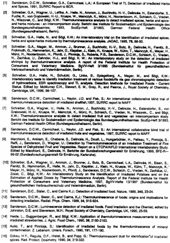 Trong một phép thử nghiệm liên phòng thí nghiệm khác lớn hơn do Tổ chức Y tế Liên bang Đức cũ (Bundesgesundheitsamt, BGA, viện nghiên cứu succesor: Viện nghiên cứu liên bang về bảo vệ sức khỏe người tiêu dùng và Thú y, BgVV), gồm 14 phòng thí nghiệm tham gia thử nghiệm trên 18 loại khác nhau của thảo mộc và gia vị hoặc hỗn hợp của chúng sau 3 tháng xử lý bằng chiếu xạ với liều tương ứng 6 kGy hoặc 11 kGy. Trong tổng số 317 mẫu được thử nghiệm có 99,1 % kết quả nhận biết đúng. Chỉ có ba mẫu đã bị chiếu xạ được phân loại là không bị chiếu xạ. Không có mẫu không chiếu xạ nào bị phân loại là đã chiếu xạ [2], [3].