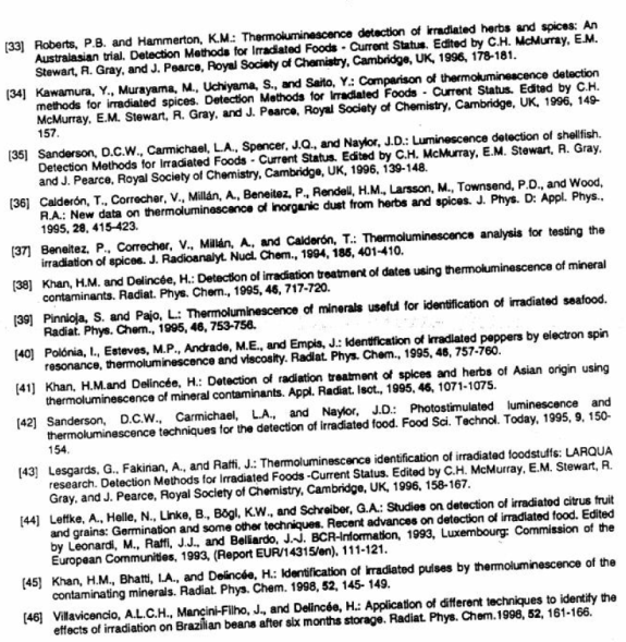 Trong trường hợp đối với thảo mộc và gia vị, phương pháp này đã được thử nghiệm trong cuộc sơ khảo nhỏ do BCR tổ chức, gồm có sáu phòng thí nghiệm tham gia, mỗi phòng phân tích 12 mẫu thảo mộc và gia vị đã chiếu xạ và không chiếu xạ [1].