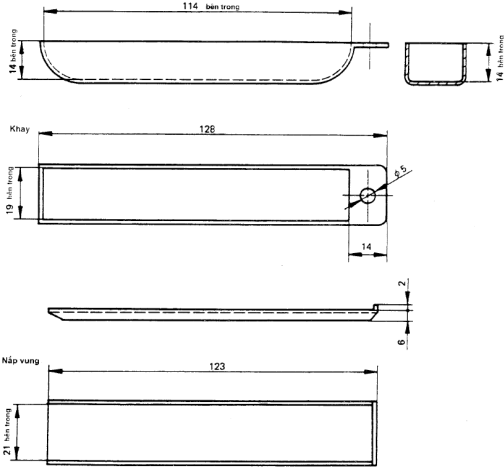 A1. Khay: được mô tả thích hợp trong hình vẽ dưới đây có đáy phẳng, với diện tích hữu ích 16 cm2 và chiều cao bên trong 14mm. Dụng cụ này có thể dùng với ống sấy trong A2. Lỗ tròn f = 5mm ở cuối khay thuận tiện cho việc kéo khay ra khỏi ống sấy bằng móc kéo.