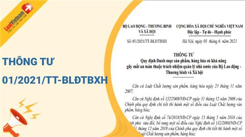 Ngày 03/6/2021, Bộ Lao động Thương binh và Xã hội ban hành Thông tư 01/2021/TT-BLĐTBXH về việc quy định Danh mục sản phẩm, hàng hóa có khả năng gây mất an toàn thuộc trách nhiệm quản lý Nhà nước của Bộ Lao động Thương binh và Xã hội.