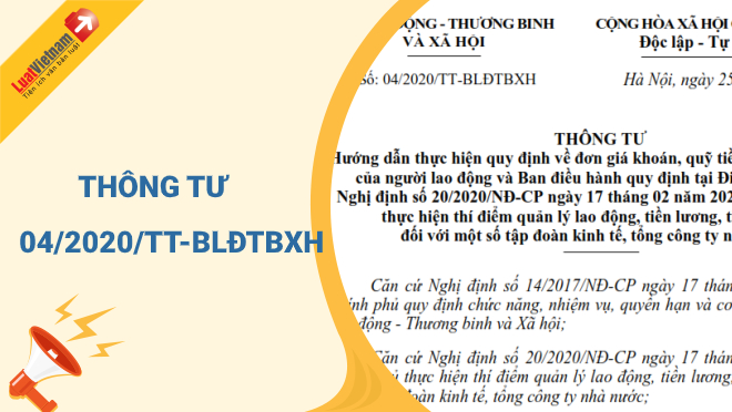 Ngày 25/5/2020, Bộ Lao động, Thương binh và Xã hội ban hành Thông tư 04/2020/TT-BLĐTBXH về việc hướng dẫn thực hiện quy định về đơn giá khoán, quỹ tiền lương thực hiện của người lao động và Ban điều hành quy định tại Điều 7, 8 Nghị định 20/2020/NĐ-CP ngày 17/02/2020 của Chính phủ về thực hiện thí điểm quản lý lao động, tiền lương, tiền thưởng đối với một số tập đoàn kinh tế, tổng công ty Nhà nước.