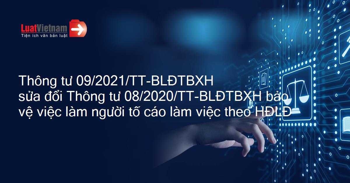 Ngày 07/9/2021, Bộ Lao động Thương binh và Xã hội đã ban hành Thông tư 09/2021/TT-BLĐTBXH về việc sửa đổi, bổ sung một số điều của Thông tư 08/2020/TT-BLĐTBXH ngày 15/10/2020 của Bộ trưởng Bộ Lao động Thương binh và Xã hội hướng dẫn về bảo vệ việc làm của người tố cáo là người làm việc theo hợp đồng lao động.