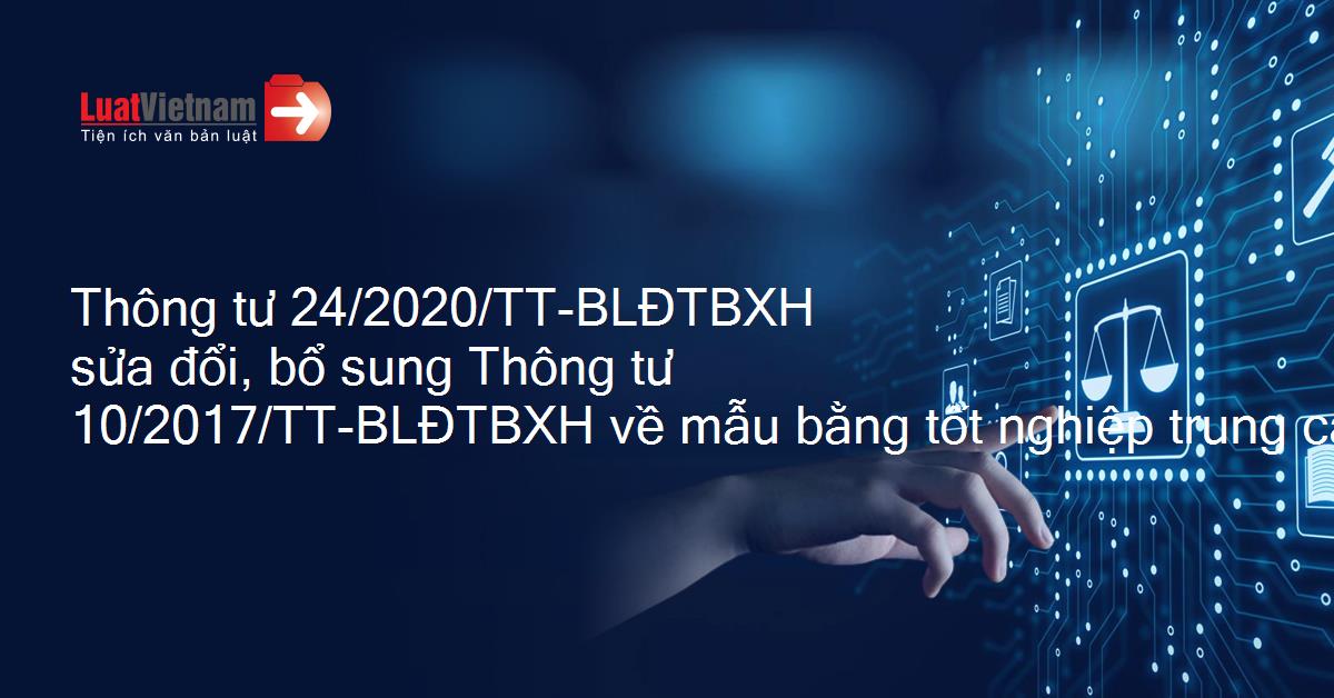 Ngày 30/12/2020, Bộ Lao động Thương binh và Xã hội ban hành Thông tư 24/2020/TT-BLĐTBXH về việc sửa đổi, bổ sung một số điều của Thông tư 10/2017/TT-BLĐTBXH ngày 13/3/2017 của Bộ trưởng Bộ Lao động Thương binh và Xã hội quy định về mẫu bằng tốt nghiệp trung cấp, cao đẳng; in, quản lý, cấp phát, thu hồi, hủy bỏ bằng tốt nghiệp trung cấp, cao đẳng.