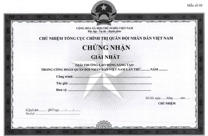 3. Hình thức của Giải thưởng Lao động sáng tạo trong Công đoàn Quân đội nhân dân Việt Nam như sau: Giấy chứng nhận của Chủ nhiệm Tổng cục Chính trị tặng cho các công trình đạt giải, kèm theo tiền thưởng; mức tiền thưởng bằng 10 lần đối với giải Nhất, 08 lần đối với giải Nhì, 06 lần đối với giải Ba, 04 lần đối với giải Khuyến khích theo mức lương cơ sở hiện hành và có mức thưởng tương đương với mức tiền thưởng này khi không thực hiện mức lương cơ sở.