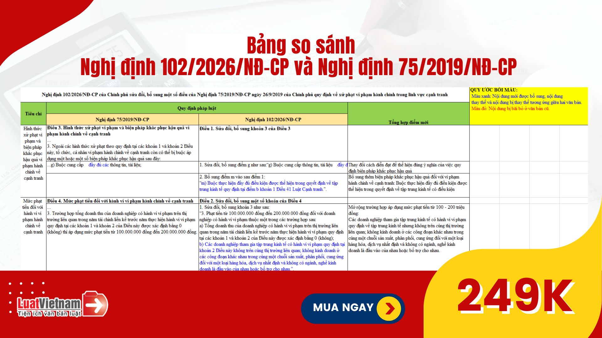 Chính phủ đã ban hành Nghị định 102/2026/NĐ-CP sửa đổi, bổ sung nhiều quy định quan trọng về xử phạt vi phạm hành chính trong lĩnh vực cạnh tranh so với Nghị định 75/2019/NĐ-CP. Bảng so sánh này sẽ giúp làm rõ các điểm thay đổi đáng chú ý, đặc biệt về mức phạt tiền và biện pháp khắc phục hậu quả.