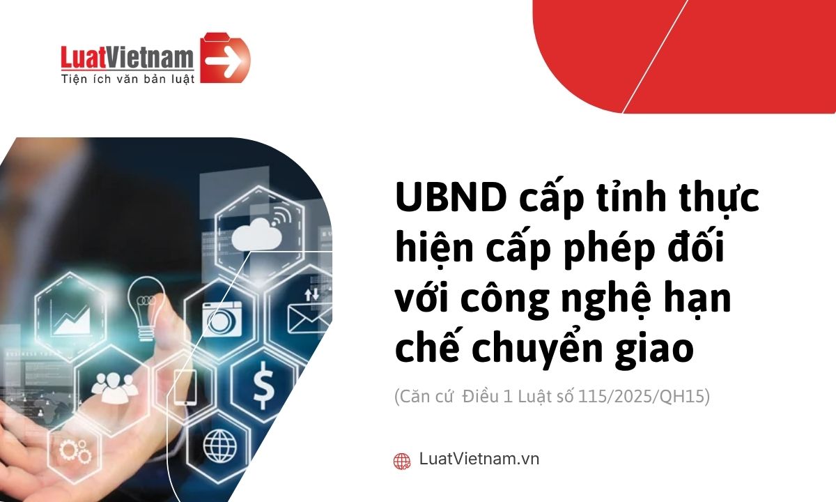 Theo quy định tại Khoản 11 Điều 1 của Luật Chuyển giao công nghệ sửa đổi 2025, thẩm quyền cấp phép đối với công nghệ thuộc danh mục hạn chế chuyển giao được chuyển giao về cho địa phương. Cụ thể, Ủy ban nhân dân cấp tỉnh sẽ trực tiếp thực hiện việc xem xét và cấp phép.