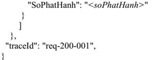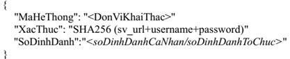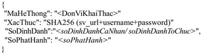 | 2 | XacThuc | String | x | Mã SHA256 được sinh từ các thông tin gồm: sv_url,username,password. Thông tin username và password sẽ được cung cấp riêng cho mỗi hệ thống kết nối |