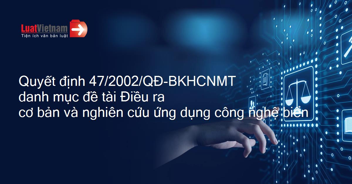 Quyết định 47/2002/QĐ-BKHCNMT của Bộ Khoa học, Công nghệ và Môi trường về việc phê duyệt Danh mục đề tài tuyển chọn thực hiện trong kế hoạch năm 2003 thuộc Chương trình khoa học và công nghệ trọng điểm cấp Nhà nước giai đoạn 5 năm 2001 - 2005: "Điều tra cơ bản và nghiên cứu ứng dụng công nghệ biển"