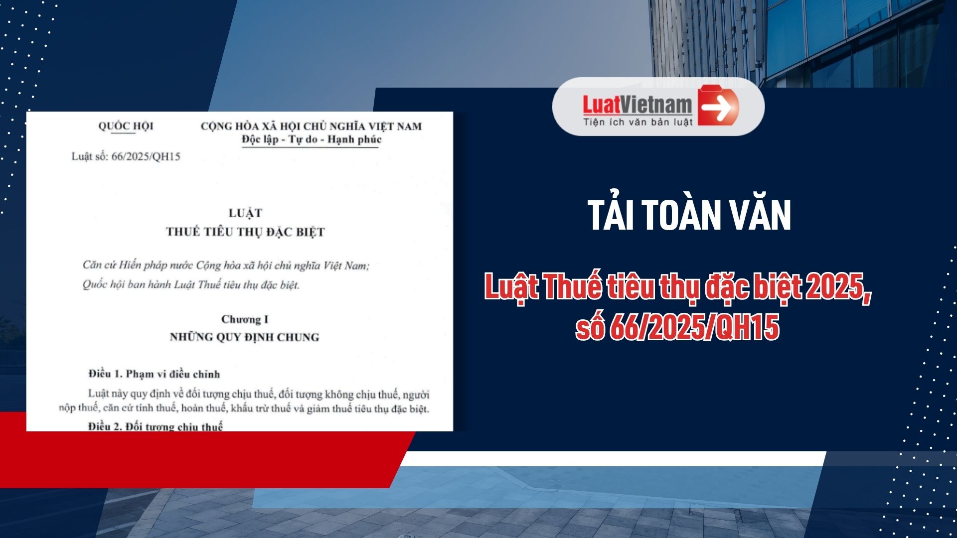 Luật Thuế tiêu thụ đặc biệt 2025, số 66/2025/QH15 được Quốc hội thông qua vào ngày 14 tháng 6 năm 2025 và sẽ có hiệu lực từ ngày 01 tháng 01 năm 2026.