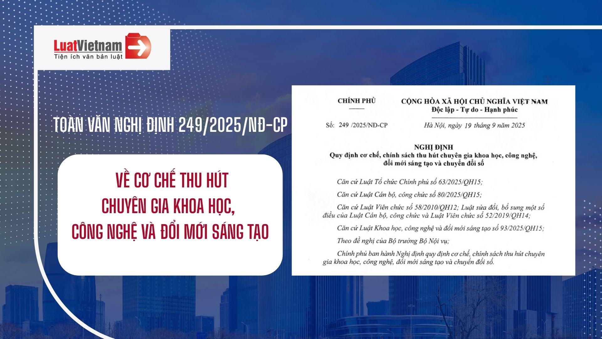 Ngày 19 tháng 9 năm 2025, Chính phủ đã ban hành Nghị định 249/2025/NĐ-CP, quy định cơ chế và chính sách thu hút chuyên gia trong các lĩnh vực khoa học, công nghệ, đổi mới sáng tạo và chuyển đổi số.