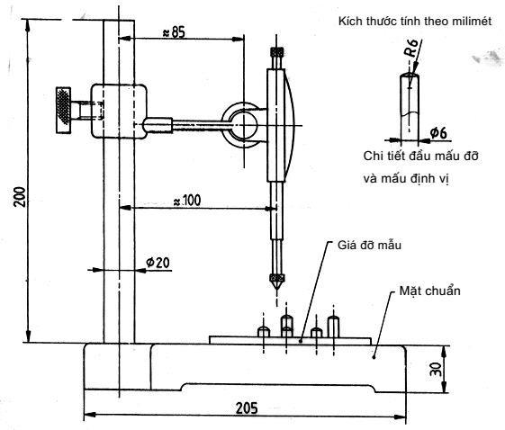 4.3. Dụng cụ đo độ dài (phương pháp 1): dùng đồng hồ đo độ dài có độ chính xác 0,01 mm, gắn trên giá đỡ có mặt chuẩn. Trên mặt chuẩn đặt bộ gá có ba mấu đỡ và hai mấu định vị (Hình 1 và Hình 2). Việc hiệu chỉnh dụng cụ thực hiện bằng một mẫu chuẩn hình trụ với kích thước chuẩn.