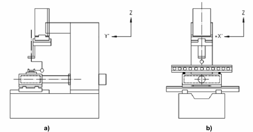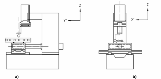 | Quan sát và tham chiếu 5.2.3.2.1.1 của TCVN 7011-1 Lắp đồng hồ so trên đầu máy. a) Đặt thước thẳng song song với chiều trục Y trong mặt phẳng XY và đặt đồng hồ so ngược với nó. Di chuyển trục Y suốt chiều dài đo và ghi số đọc của đồng hồ so. b) Kiểm lặp lại theo cùng một cách trong mặt phẳng YZ. | ||
