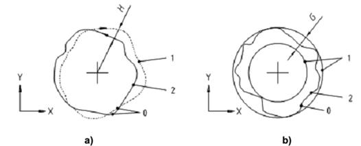 | a) Độ trễ theo đường tròn; b) Sai lệch theo đường tròn. (Kiểm đường tròn và kiểm gia công có thể được sử dụng thay thế). | ||||