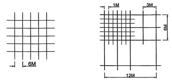 5.2. Lưới mô đun có các ô lưới kích thước khác nhau đặt chồng lên nhau được vẽ như sau: ô lưới nhỏ hơn được vẽ bằng nét mảnh hơn, ô lưới lớn hơn được vẽ bằng nét đậm hơn (Xem Hình 6).