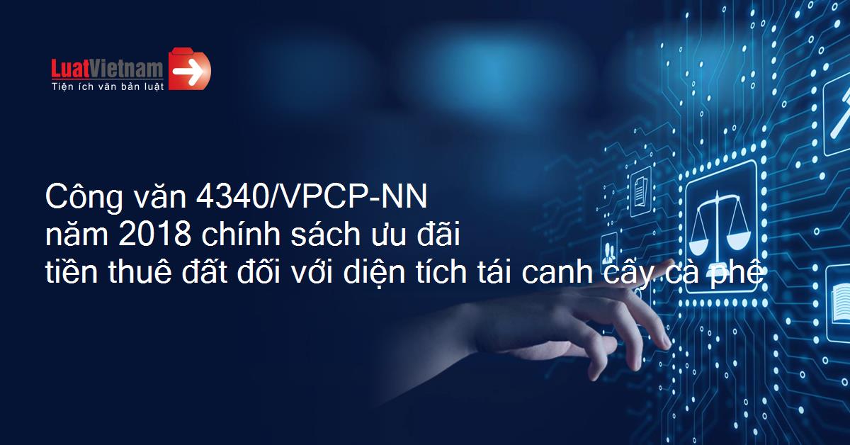 | VĂN PHÒNG CHÍNH PHỦ Số: 4340/VPCP-NN V/v: Chính sách ưu đãi tiền thuê đất đối với diện tích tái canh cây cà phê | CỘNG HÒA XÃ HỘI CHỦ NGHĨA VIỆT NAM Hà Nội, ngày 11 tháng 5 năm 2018 |