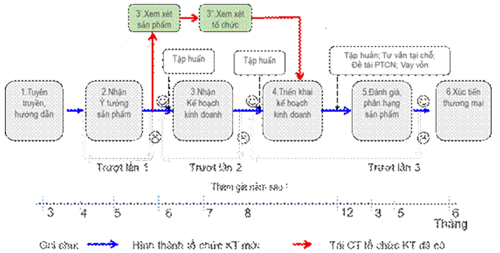 Các bước triển khai Chu trình OCOP cụ thể gồm: (1) Tuyên truyền, hướng dẫn về OCOP; (2) Nhận đăng ký ý tưởng sản phẩm; (3) Nhận phương án, dự án sản xuất kinh doanh; (4) Triển khai phương án, dự án sản xuất kinh doanh; (5) Đánh giá và phân hạng sản phẩm; (6) Xúc tiến thương mại.