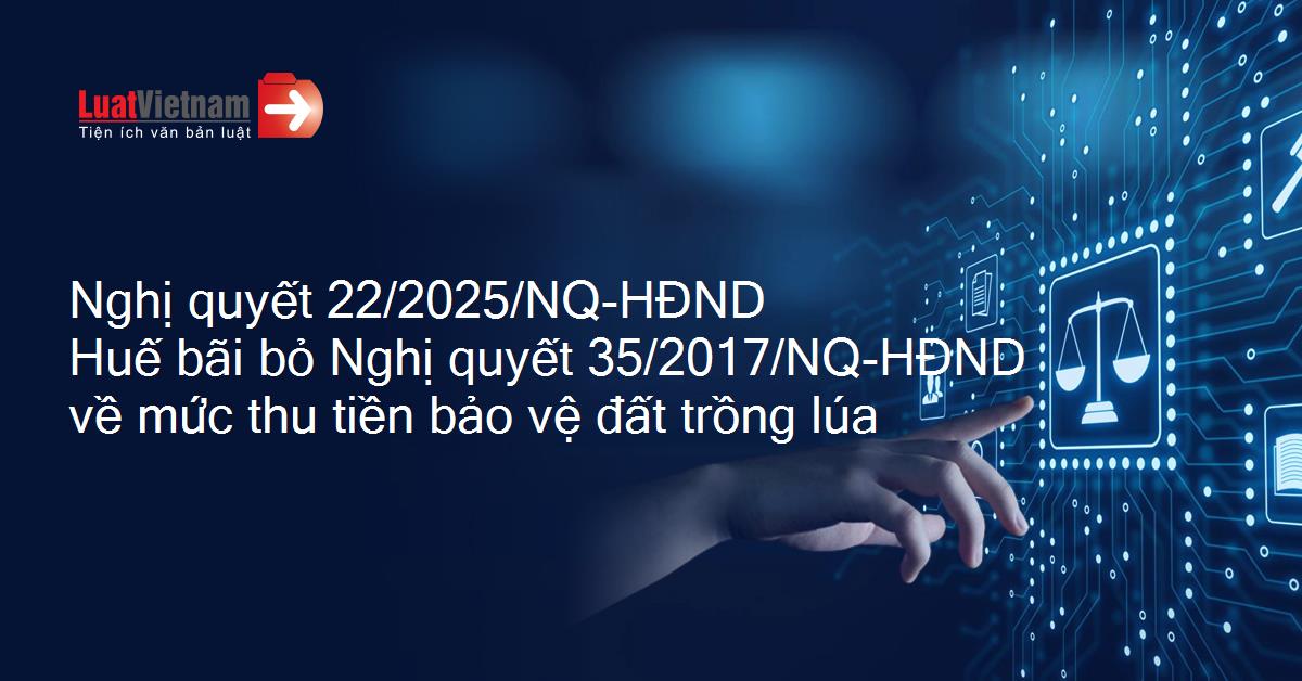 Nghị quyết 22/2025/NQ-HĐND của Hội đồng nhân dân thành phố Huế về bãi bỏ Nghị quyết 35/2017/NQ-HĐND ngày 08/12/2017 của Hội đồng nhân dân tỉnh quy định về mức thu tiền bảo vệ, phát triển đất trồng lúa trên địa bàn tỉnh Thừa Thiên Huế (nay là thành phố Huế)