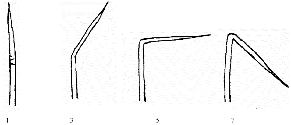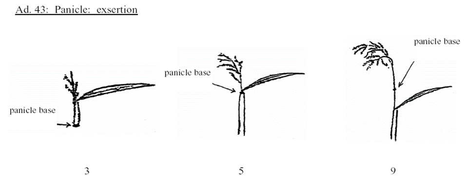 18. Tính trạng 45 - Thời gian tàn của lá: Quan sát các lá dưới lá đòng ở thời điểm thu hoạch; (3) các lá đã chết; (5) có 1 lá còn xanh; (7) có 2 hoặc nhiều hơn lá còn xanh.