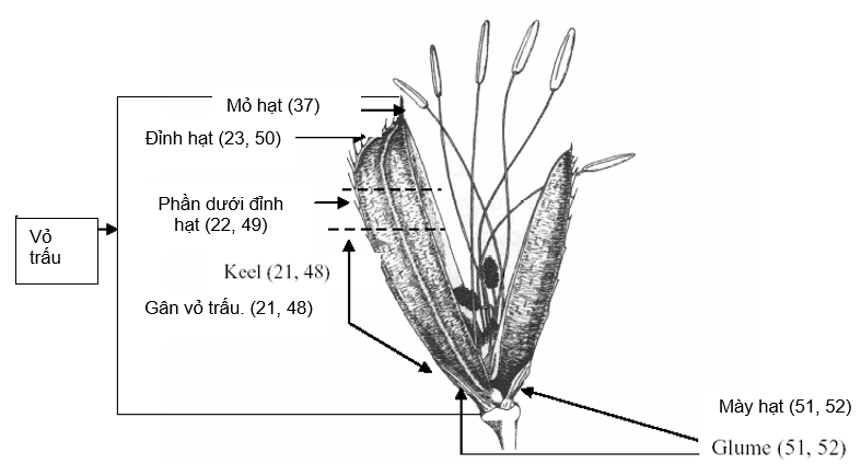 | 21. (+) VS QN | Vỏ trấu: Sắc tố antoxian của gân (quan sát sớm) Lemma: Anthocyanin coloration of keel (early observation) | 65 | Không có hoặc rất nhạt Nhạt Trung bình Đậm | 1 3 5 7 |