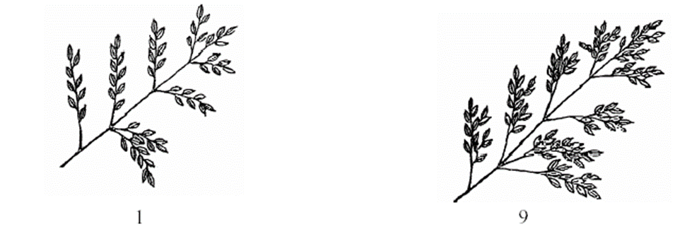 | Khóm: Tập tính sinh trưởng Culm: habit | 40 | Đứng Nửa đứng Mở Xoè) Bò lan sát mặt đất | 1 3 5 7 9 |