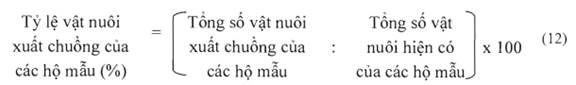| Tổng số vật nuôi xuất chuồng trong kỳ điều tra | = | Tỷ lệ vật nuôi xuất chuồng của các hộ mẫu (%) | x | Tổng số vật nuôi hiện có | (11) |