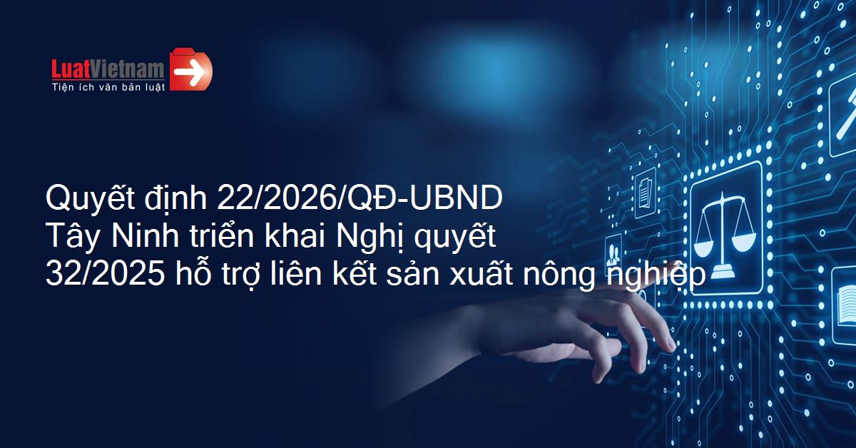 Quyết định 22/2026/QĐ-UBND của Ủy ban nhân dân tỉnh Tây Ninh về việc triển khai thực hiện Nghị quyết 32/2025/NQ-HĐND ngày 10/12/2025 của Hội đồng nhân dân tỉnh phê duyệt chính sách hỗ trợ liên kết sản xuất và tiêu thụ sản phẩm nông nghiệp trên địa bàn tỉnh Tây Ninh giai đoạn 2026-2030