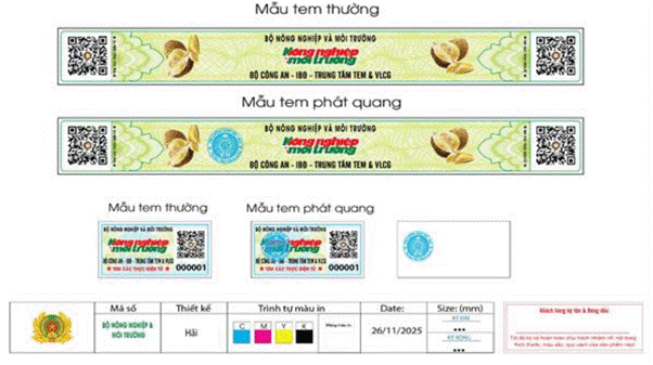 Ghi chú: - Mẫu tem dài: Tem xác thực điện tử gắn QR cho quả Sầu riêng