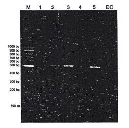 CHÚ THÍCH: M: thang chuẩn marker 100bp; 1. Chủng Bacillus mycoides ATCC 6462 (đối chứng dương); 2- 5: Bacillus mycoides giả định; ĐC: Đối chứng âm