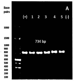 Hình A.3. Kết quả chạy điện di trên gel agarose 1,5 % sản phẩm PCR với mồi đặc hiệu của gen gyrA - 734 bp (Hình A) trên 5 khuẩn lạc giả định (1-5).