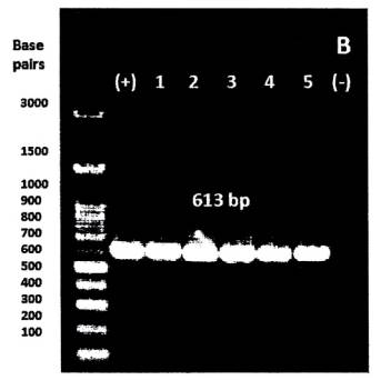 Hình A.4. Kết quả chạy điện di trên gel agarose 1,5 % sản phẩm PCR với mồi đặc hiệu của gen gyrB - 613 bp (Hình B) trên 5 khuẩn lạc giả định (1-5).