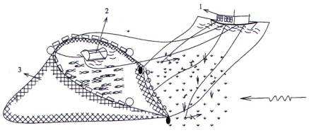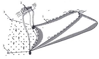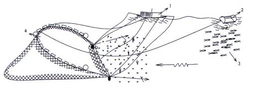CHÚ THÍCH: Trong quá trình hoạt động, miệng lưới được đặt chìm ở độ sâu nhất định, sử dụng nguồn sáng hoặc chà rạo tập trung đàn cá vào vùng tác dụng của lưới, khi cá tập trung đủ lớn, nhấc giềng miệng lên khỏi mặt nước bằng tay hoặc bằng máy tời và bắt cá.