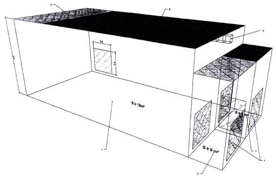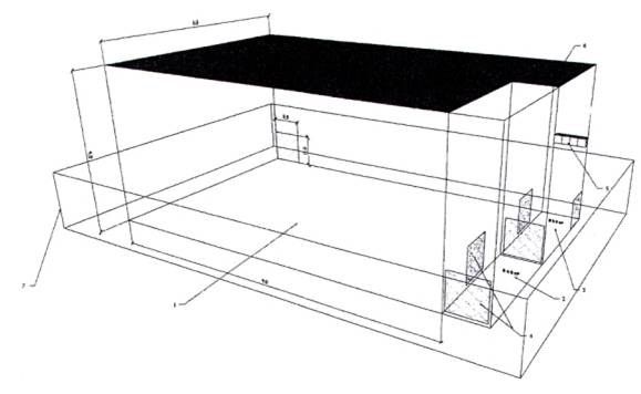 | 1 Chuồng chính 2 Chuồng phụ (diện tích tối thiểu 0,9m2) 3 Chuồng trú ẩn (diện tích tối thiểu 0,9m2) | 4 Cửa chuồng 5 Hộp nghỉ 6 Phần mái chuồng trú ẩn che kín bằng vật liệu thích hợp 7 Hàng rào công cộng bao quanh |