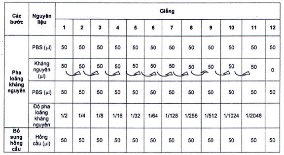 - Pha loãng kháng nguyên: sử dụng pipet (6.3) trộn đều kháng nguyên với PBS ở cột 1, hút 50 μl chuyển sang cột 2, trộn đều, hút 50 μl chuyển sang cột 3, trộn đều, tiếp tục làm như vậy đến cột 6 rồi hút bỏ đi 50 μl.
