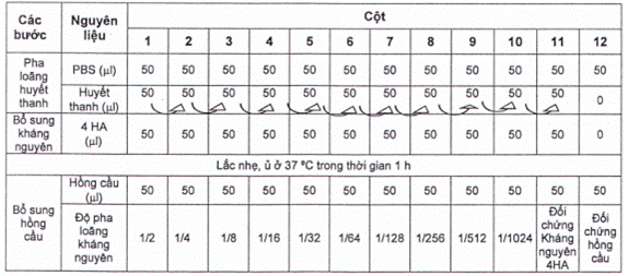Các bước tiến hành thực hiện phản ứng HI được nêu ở bảng B.1, ví dụ sơ đồ bố trí mẫu trên đĩa phản ứng được nêu ở bảng B.2.