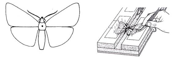- Đặt trưởng thành vào giá định hình mẫu tiêu bản côn trùng (3.21). Dùng panh mềm (3.13) để căng cánh của trưởng thành, dùng giấy và kim côn trùng để giữ cố định cánh (hình 10).