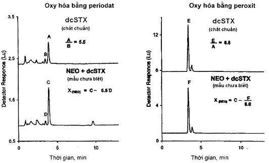 C, D, và F là diện tích pic của mẫu chưa biết bị nhiễm dcSTX và NEO sau khi oxy hóa bằng periodat (pic C, pic D) và peroxil (pic F).