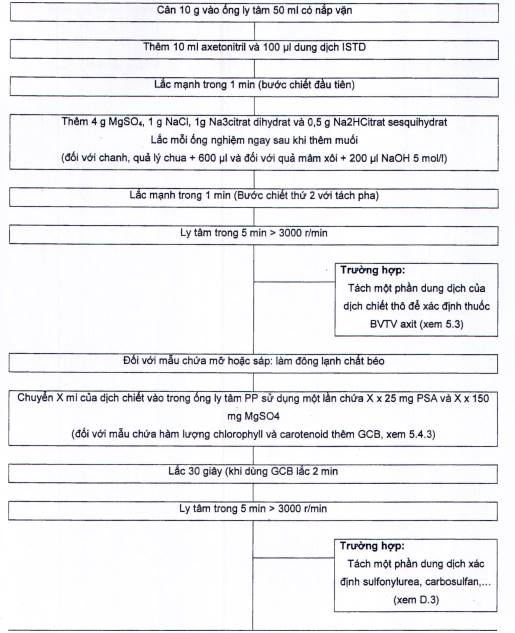 Mẫu đã đồng nhất được chiết bằng axetonitril. Đối với mẫu có hàm lượng nước thấp (<80 %) phải thêm nước trước khi chiết để có tổng lượng nước khoảng 10 g. Sau khi thêm MgSO4, NaCl và muối đệm citrat, hỗn hợp được lắc mạnh và ly tâm để tách pha. Một phần của pha hữu cơ được làm sạch bằng chiết phân tán pha rắn (d-SPE) với các loại chất hấp phụ kết hợp với MgSO4 để loại nước; Sau khi làm sạch bằng chất hấp phụ amino (Ví dụ: PSA), dịch chiết được axit hóa với một lượng nhỏ axit formic để tăng độ bền của những thuốc BVTV nhạy với bazơ. Dịch chiết sau cùng được xác định trực tiếp bằng LC-MS và GC-MS. Định lượng bằng phương pháp nội chuẩn, dung dịch nội chuẩn được thêm vào dịch chiết sau khi thêm dung môi axetonitril. Tóm tắt của phương pháp được trình bày bằng biểu đồ nêu trong Phụ lục C.
