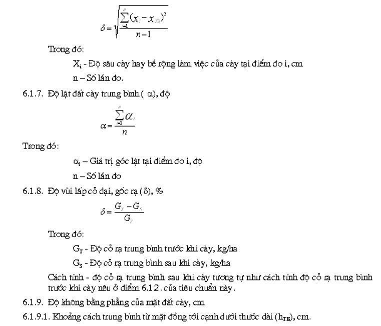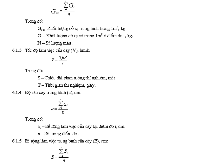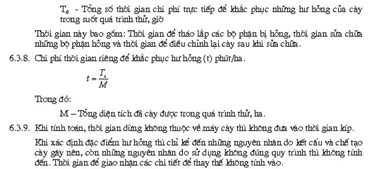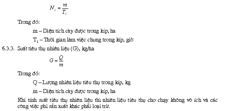 | 1. Đặc điểm ruộng canh tác: theo quy định ở bảng 3 2. Chất lượng làm việc Độ sâu cày trung bình, cm Bề rộng làm việc trung bình, cm Mức độ lật đất cày, độ Độ dính đất và mức độ ùn vướng Số truyền làm việc của liên hợp máy 3. Công nghệ sử dụng Diện tích đất cày được, ha Thời gian làm việc, h Thời gian làm việc thuần tuý, h Các thành phần thời gian kíp Tổng thời gian dùng để khắc phục những hư hỏng của máy cày, h Lượng nhiên liệu tiêu thụ, kg Năng suất giờ thuần tuý, ha/giờ Năng suất giờ làm việc kíp, ha giờ trong kíp Năng suất kíp, ha/kíp Suất tiêu thụ nhiên liệu kg/ha Hệ số sử dụng thời gian làm việc Hệ số tin cậy của quá trình sản xuất Hệ số chăm sóc kỹ thuật Hệ số bền vững sử dụng ( chắc chắn ít hỏng) Chi phí kim loại riêng: - Cho một mét bề rộng làm việc của cày, kg/m - Cho một đơn vị diện tích trong 1 giờ làm việc thuần tuý, kg giờ/ha 4. Độ bền - Kết hợp với kiểm tra kỹ thuật: thử đánh giá khả năng làm việc chắc chắn liên tục ( không hỏng, đứt, gẫy, ít mài mòn biến dạng) các máy cày. - Chi phí thời gian để khắc phục hư hỏng cho 1 ha đất phút/ ha Chú thích: Chỉ theo dõi xác định một cách chi tiết các chỉ tiêu đối với các kíp kiểm tra còn trong đại trà sản xuất thì chỉ yêu cầu xác định: - Thời gian làm việc, giờ - Khối lượng công việc đã làm được, ha - Nhiên liệu tiêu thụ, kg - Thời gian dùng để khắc phục những hư hỏng và những nhận xét chung về điều kiện làm việc và chất lượng làm việc, giờ. |