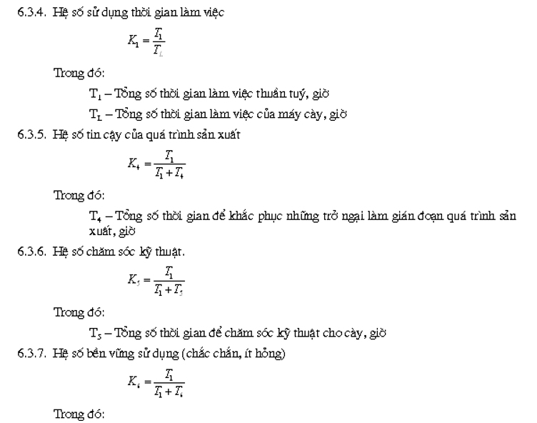 | Tổng diện tích đất đã cày được, ha Tổng thời gian làm việc kíp, giờ Tổng thời gian làm việc thuần tuý, giờ Các thành phần thời gian kíp * Tổng thời gian dừng để khắc phục những hư hỏng của máy cày, giờ Tổng thời gian vi phạm quá trình sản xuất (khắc phục, ùn vướng,….) giờ Tổng số nhiên liệu đã tiêu thụ, kg Năng suất giờ thuần tuý, ha/giờ Năng suất giờ làm việc, kíp, ha/giờ kíp Năng suất kíp, ha/kíp Xuất tiêu thụ nhiên liệu, kg/ha Hệ số sử dụng thời gian làm việc, Hệ số tin cậy của quá trình sản xuất Hệ số chăm sóc kỹ thuật Hệ số bền vững sử dụng (chắc chắn, ít hỏng) Chi phí thời gian để khắc phục hư hỏng cho 1 ha đất cày được, phút/ha Chi phí kim loại riêng: Cho một mét bề rộng làm việc của cày, kg/m Cho 1 đơn vị diện tích trong 1 giờ làm việc thuần tuý, kg giờ/ha |